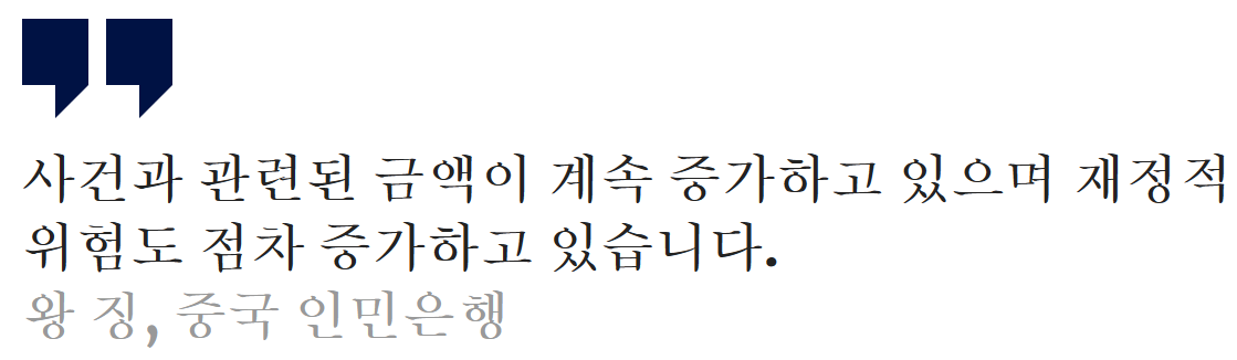- 사기와 자금세탁의 연관성: 통신 사기, 온라인 도박, 지하 은행 등 다양한 금융 범죄가 자금세탁과 밀접하게 연결되어 있으며 새로운 도전을 제기하고 있습니다. 중국은 올해 9월까지 자금세탁으로 1,700여 명을 기소했으며, 이는 작년 동기 대비 15% 증가한 수치입니다.