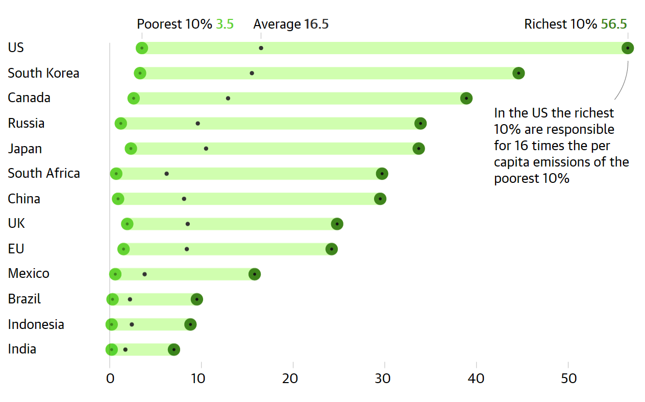 가디언이 입수한 데이터에 따르면 많은 국가에서 상위 10%의 부유층이 하위 10%의 빈곤층보다 기후 온난화를 유발하는 탄소 배출량을 최대 40배 더 많이 배출합니다. 상위 10%가 전 세계 탄소 배출량의 절반을 책임지고 있기 때문에 이러한 격차는 기후 행동의 경제성에 대한 반발을 불러일으킬 수 있습니다.