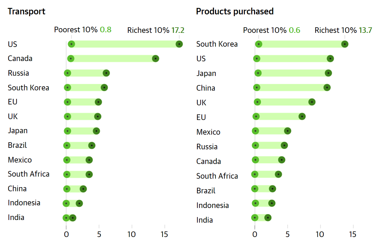 인도와 인도네시아를 포함한 빈곤국에서는 최하위 10%가 도로 여행과 제품 구매를 통해 배출하는 이산화탄소가 거의 없는 것으로 나타났습니다.