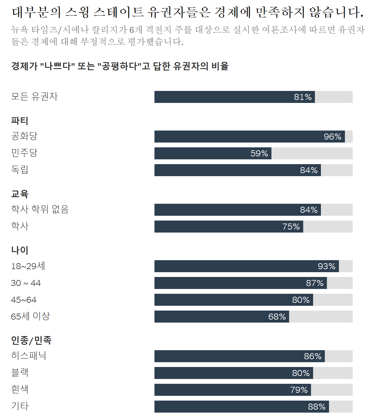 하지만 미국인들은 반드시 그렇게 생각하지는 않습니다. 최근 뉴욕 타임즈/시에나 칼리지가 6개 스윙 스테이트 유권자를 대상으로 실시한 여론조사에서 10명 중 8명은 경제가 보통이거나 나쁘다고 답했습니다. 경제가 우수하다고 답한 비율은 2%에 불과했습니다. 성별, 인종, 연령, 학력, 지역, 소득, 지지 정당에 관계없이 모든 미국인 그룹의 대다수가 부정적인 견해를 가지고 있었습니다.
