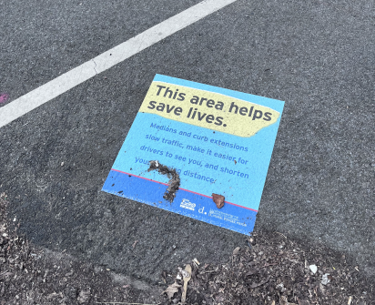 예를 들어, 워싱턴 DC에서는 새로운 도로 연석과 중앙분리대에 다음과 같은 문구가 적힌 포장 스티커를 부착하기도 합니다: "이 지역은 생명을 구하는 데 도움이 됩니다." 그런 다음 이러한 디자인 개입이 "교통량을 줄이고, 운전자가 운전자를 더 잘 볼 수 있게 하며, 횡단 거리를 단축"한다고 간략하게 설명합니다.