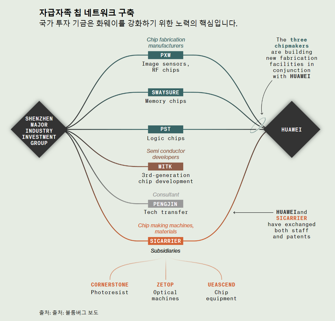 화웨이를 지원하는 국영 기업 네트워크의 중심에는 화웨이 본사가 있는 선전 시정부가 운영하는 투자 펀드가 있습니다. 이 문제에 정통한 사람들에 따르면 선전 주요 산업 투자 그룹은 2019년에 국영 자본으로 설립되었으며, 중국의 칩 노력과 특히 화웨이를 지원하라는 직접적인 명령을 받았다고 합니다.