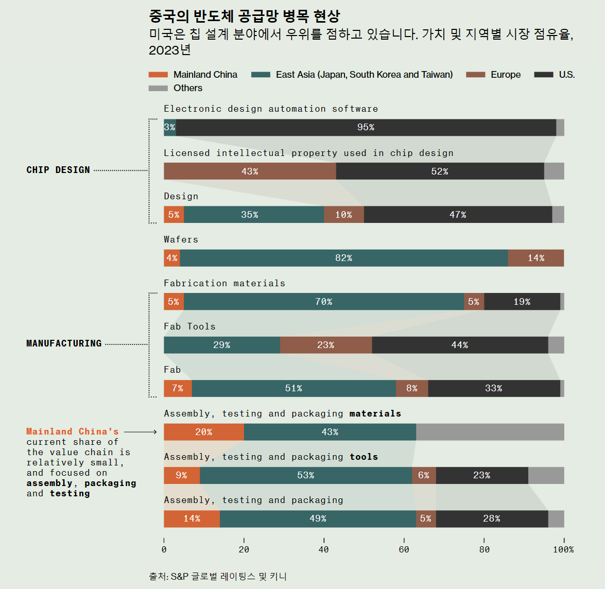 중국이 반도체 공급망의 각 단계마다 자급자족을 구축할 필요는 없습니다. S&P 글로벌 레이팅스의 애널리스트 클리포드 커츠는 미국과 동맹국들이 공급을 차단할 수 있는 4~5단계에서 국내 대안을 마련하는 것이 핵심이라고 말합니다. 즉, 중국과 화웨이는 리소그래피, 웨이퍼 생산, 전자 설계 자동화 또는 EDA와 같은 집중된 분야에 집중할 가능성이 높습니다.