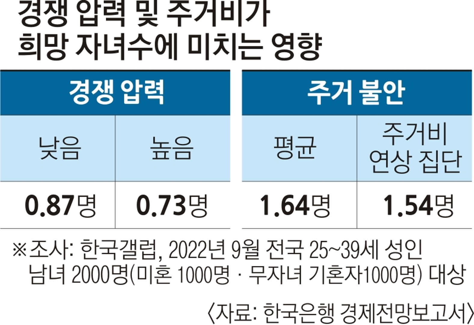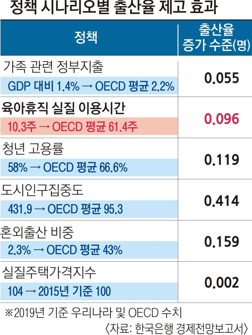 원인과 대책: 저출산의 근본 원인으로 도시의 높은 인구밀도로 인한 경쟁 압박, 고용·주거·양육에 대한 불안을 들었다. 연구원은 청년의 불안과 경쟁 압력을 해소하기 위해 육아휴직, 고용률, 가족 관련 정부 지출, 도시인구집중도, 혼외출산 비중, 실질주택가격지수 등을 OECD 평균 수준으로 맞추는 6가지 정책 시나리오를 제시했다. 이를 달성하면 출산율을 최대 0.845명 늘릴 수 있다고 전망했다.