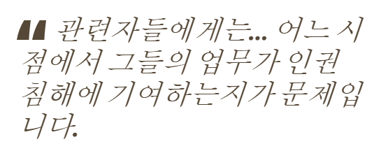 창의적이고 교양 있고 인도적이며 지적인 사람들이 대부분인 관련 종사자들에게는 자신의 업무가 어느 지점에서 인권 침해에 기여하는지가 문제입니다. 네옴, 제다 센트럴 및 기타 프로젝트에서 인권 침해는 단지 불행한 배경 사건이 아니라 새 건물을 짓는 건설 현장 자체가 범죄 현장입니다. 알울라에서도 강제 퇴거가 발생했습니다. 제가 듣기로는, 확인하지는 못했지만, 피해를 입은 사람들은 대부분 보상에 만족하고 있다고 합니다.