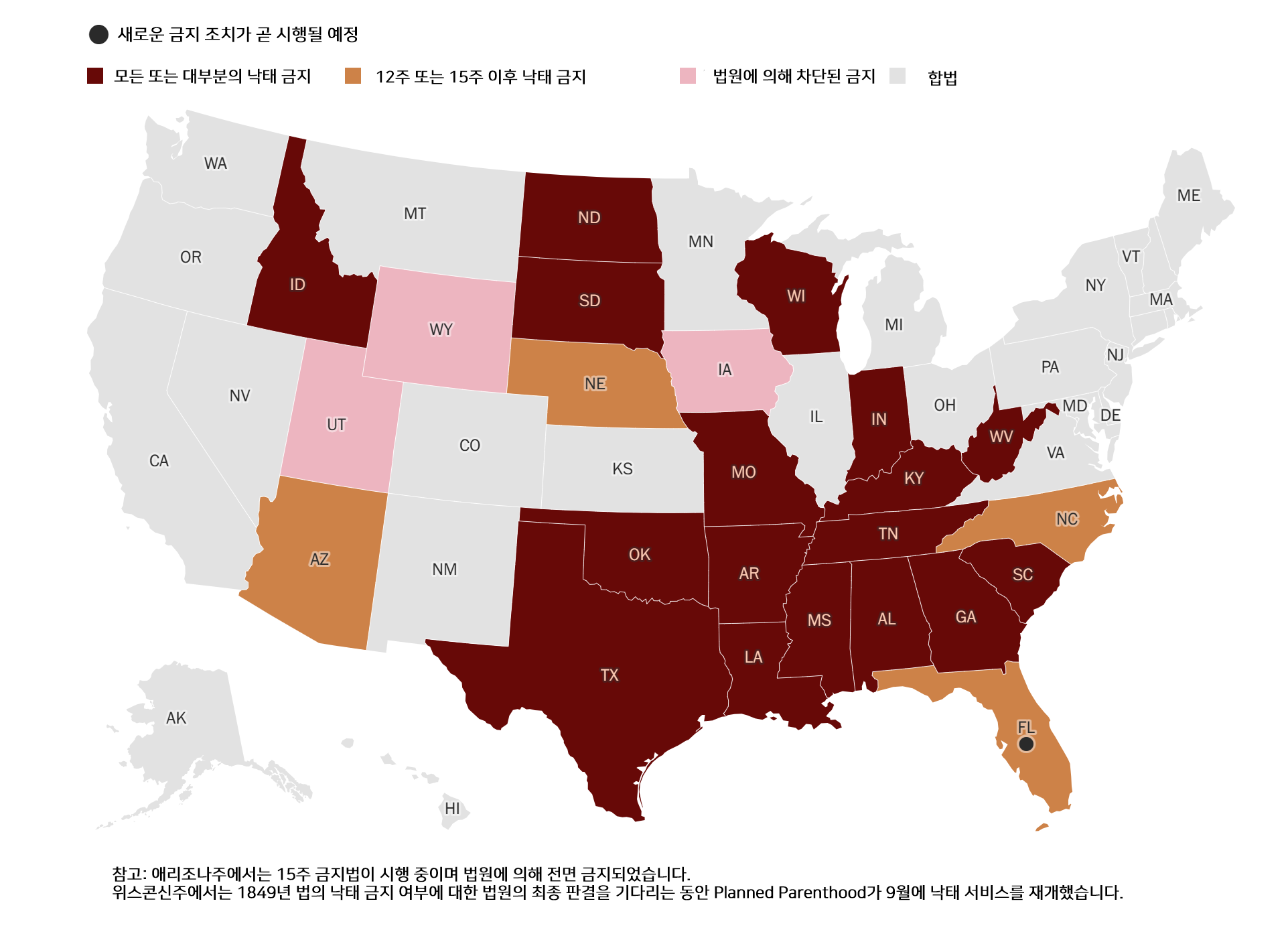 - 로 대 웨이드 판결 뒤집기: 미국 연방대법원이 로 대 웨이드 판결을 뒤집어 낙태의 합법성을 주별로 결정하도록 했습니다. 이로 인해 낙태가 제한되거나 금지된 주에서 여성들이 낙태를 받기 위해 다른 주로 이동하거나 불법적인 방법을 사용하고 있습니다.