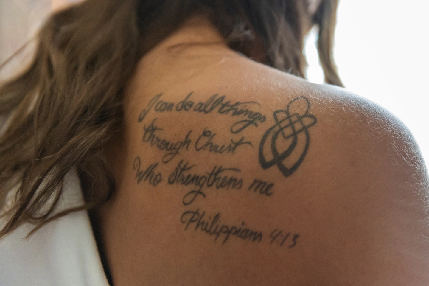 촬영장에서 베셰어의 미디어 팀은 심플한 네이비 드레스를 선택한 다음, 듀발의 고인이 된 조카에게 헌정하는 천사 날개 문신을 팔에 에어브러시로 새길 수 있도록 허락을 요청했습니다.