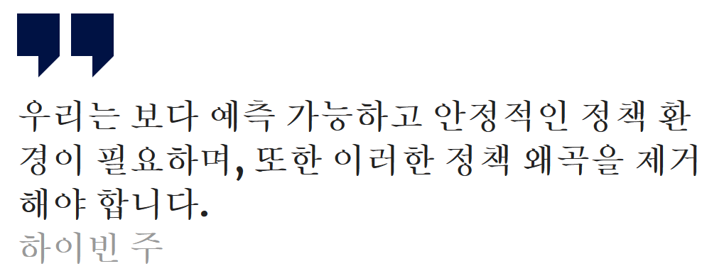 이어 "최근 몇 년간 정책의 잦은 변동을 겪었기 때문에 예측 가능하고 안정적인 정책 환경이 필요하며, 이러한 정책 왜곡을 없애야 한다"고 덧붙였다.
