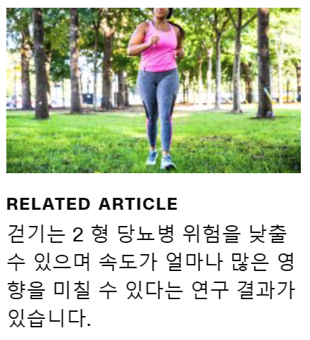 - 걷기 속도와 제 2형 당뇨병 위험 감소의 비율: 연구자들은 10개의 이전 연구를 검토하고, 걷기 속도와 제 2형 당뇨병 발병 위험과의 관계를 분석했습니다. 그 결과, 쉽거나 느리게 걷는 것과 비교했을 때, 평균적이거나 보통으로 걷는 것은 위험을 15% 낮추고, 꽤 빠르게 걷는 것은 24% 낮추고, 빠르거나 걸음걸이로 걷는 것은 39% 낮추는 것으로 나타났습니다.
