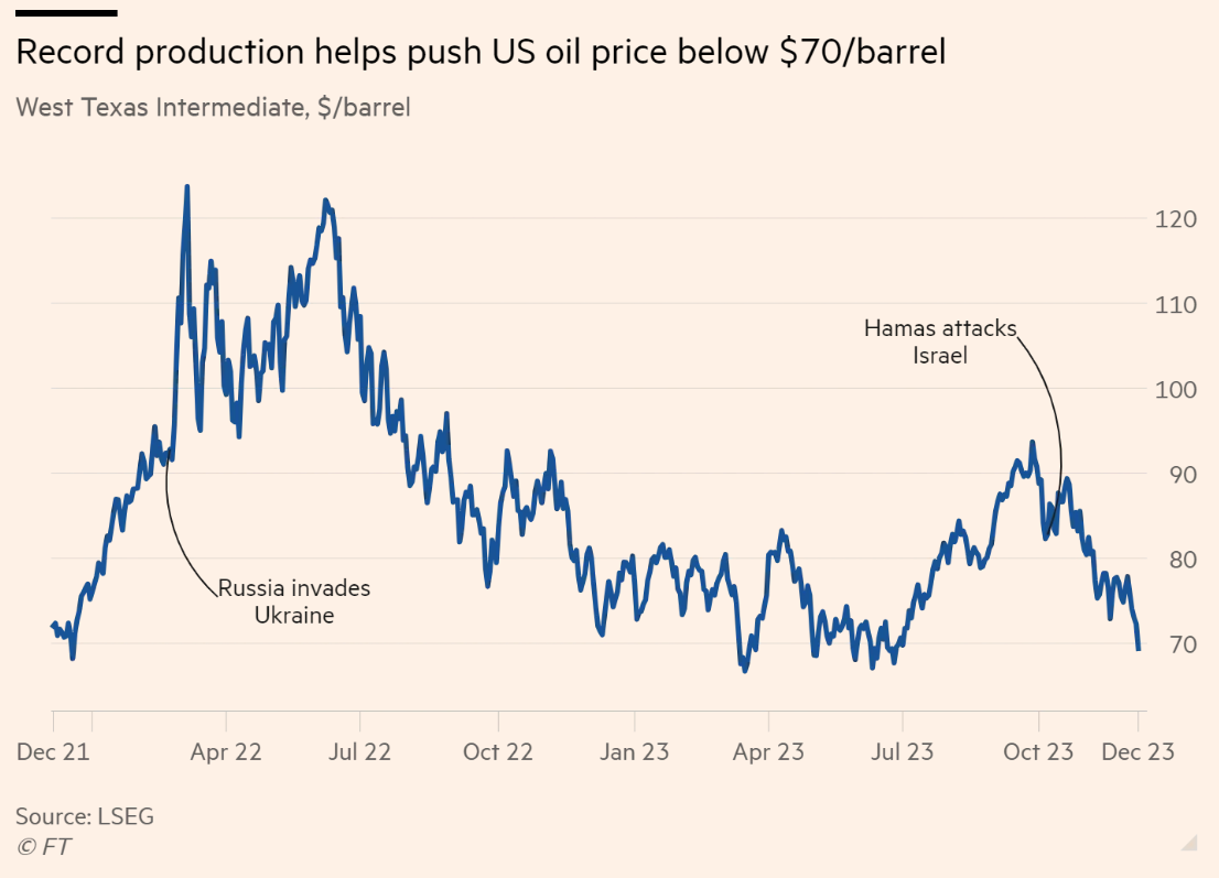 9월 미국 원유 생산량은 하루 1,320만 배럴로 사상 최고치를 기록했으며, 이는 전 세계 원유 생산량의 약 8배럴 중 1배럴을 차지합니다. 이는 공식적인 예측을 뛰어넘는 것으로, 월스트리트나 환경 규제로 인해 미국 석유 산업이 제약을 받고 있다는 주장에 도전장을 내민 것입니다. 새로운 공급은 또한 미국 관리들이 두바이에서 열린 유엔 기후 회담에서 화석 연료를 단계적으로 폐지하려는 노력에 동참함에 따라 Biden 행정부에 불편 함을주고 있습니다. 서부 텍사스 중질유는 7월 이후 처음으로 배럴당 70달러 아래로 떨어졌는데, 이는 부분적으로는 미국 셰일 유전의 예상보다 높은 생산량에 힘입은 것입니다.