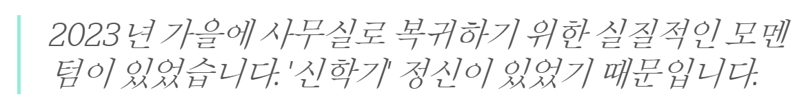 불과 4년 전만 해도 정규직 직원이 가끔씩이라도 재택근무를 하는 것은 극히 드문 일이었고, 특수한 상황에서 소수에게만 주어지는 특권이었습니다. 그러던 중 코로나19가 창궐하면서 사무실에서 대량 퇴근 사태가 벌어졌습니다. 갑자기 사람들은 대부분 처음으로 원격으로 일해야 했고, 많은 사람들이 재택근무가 허용하는 유연성과 자율성을 즐겼다는 것을 알게 되었습니다.