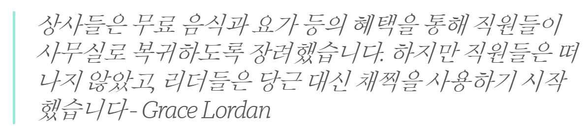 런던 정경대학의 행동과학 부교수인 그레이스 로던은 "이전에는 상사들이 무료 음식이나 요가 같은 혜택을 통해 직원들이 사무실로 복귀하도록 인센티브를 제공했습니다."라고 말합니다. "직원들이 떠나지 않자 리더들은 당근을 채찍으로 바꾸기 시작했습니다."