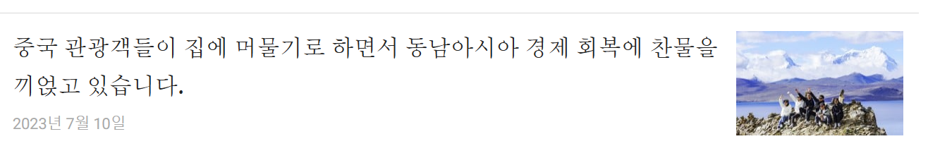 - 중국인 관광객의 해외여행 감소 : 코로나19 이후 중국의 경제 회복이 미약하고 해외여행에 대한 소비자 심리가 부정적이어서 동남아시아 국가들이 중국인 관광객의 유입이 기대에 미치지 못하고 있다는 사실을 보여줍니다.