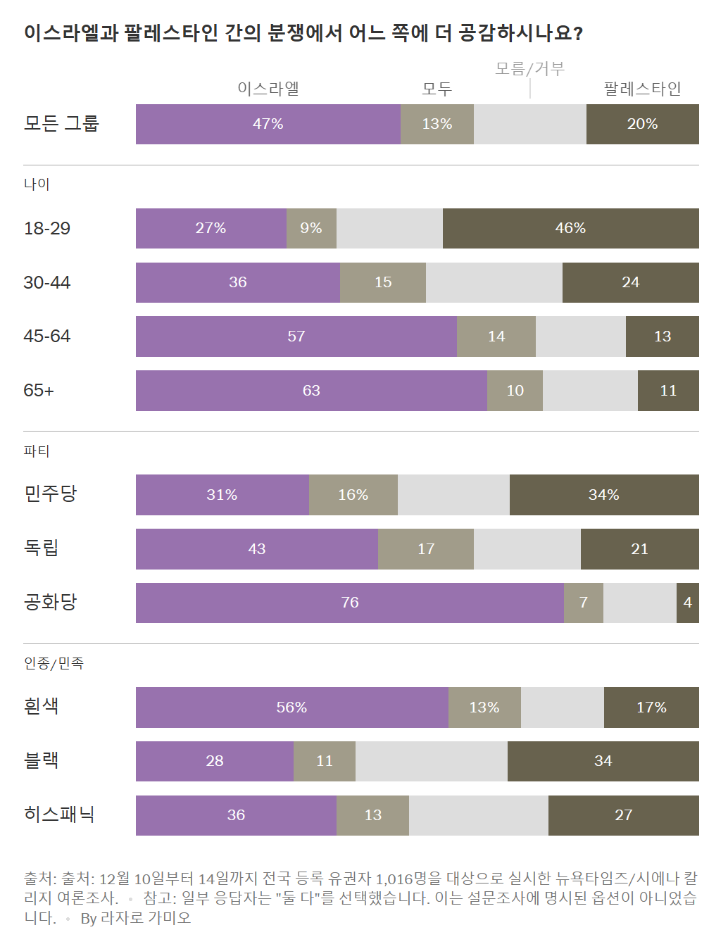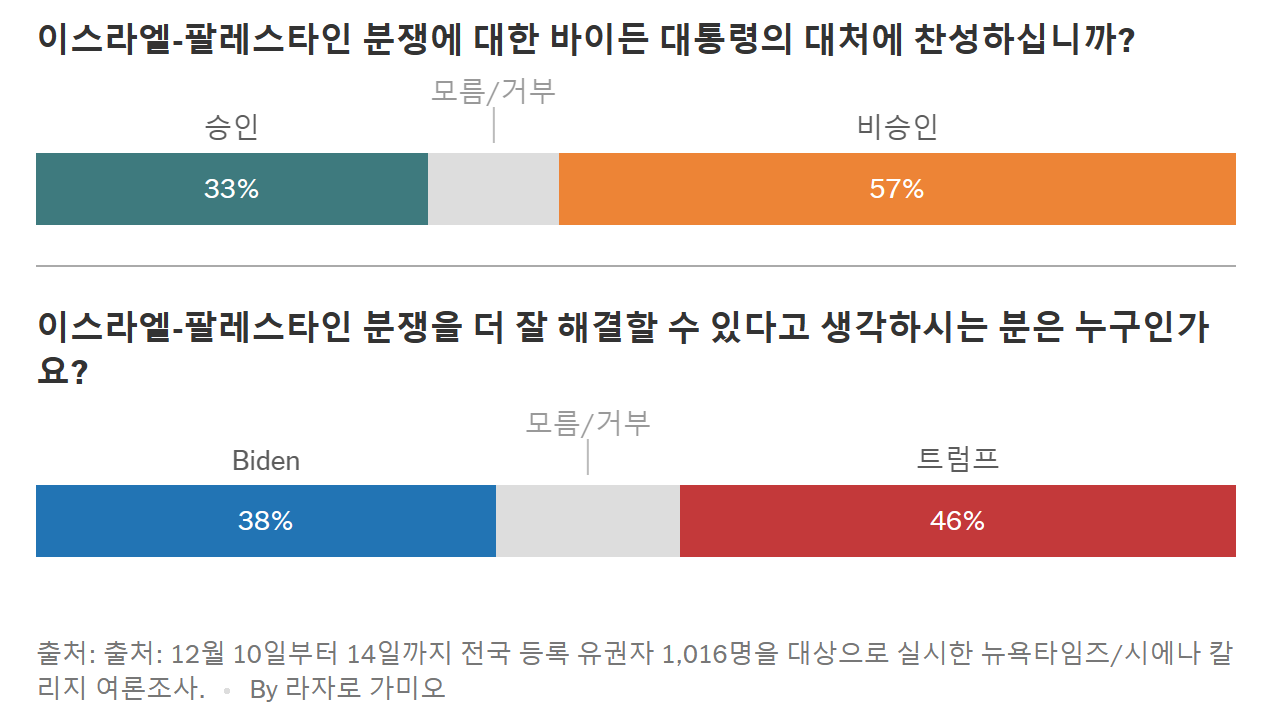 - 바이든 대통령의 가자 지구 대응에 대한 미국인들의 불만: 뉴욕타임스/시에나 대학교 설문조사에 따르면, 미국 유권자들은 이스라엘과 팔레스타인 사이의 피의 갈등에 대해 바이든 대통령의 대응을 넓게 부정적으로 평가하고 있으며, 특히 젊은 세대는 이스라엘의 행동과 행정부의 대응에 더욱 비판적이다.
