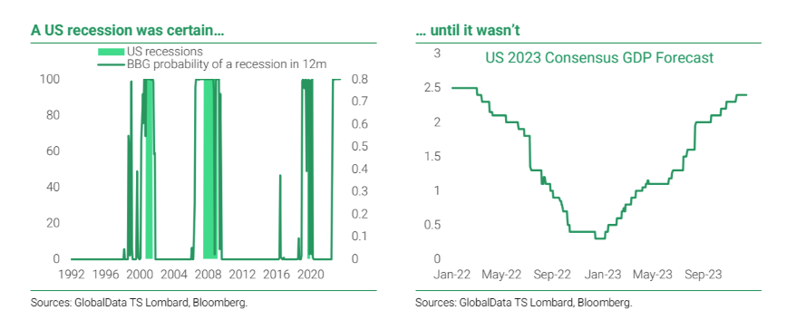 매크로본드만이 아닙니다. 지난 1월만 해도 3분기의 5.9% 성장률만큼 강력한 성장률을 예측한 사람은 찾아볼 수 없었습니다. 블룸버그의 자체 경기 침체 예측기는 경기 침체가 거의 확실하다고 했지만, 우리가 설문조사한 경제학자들의 컨센서스 예측은 점점 더 올라갔습니다. 이 차트는 TS Lombard가 제작한 것입니다: