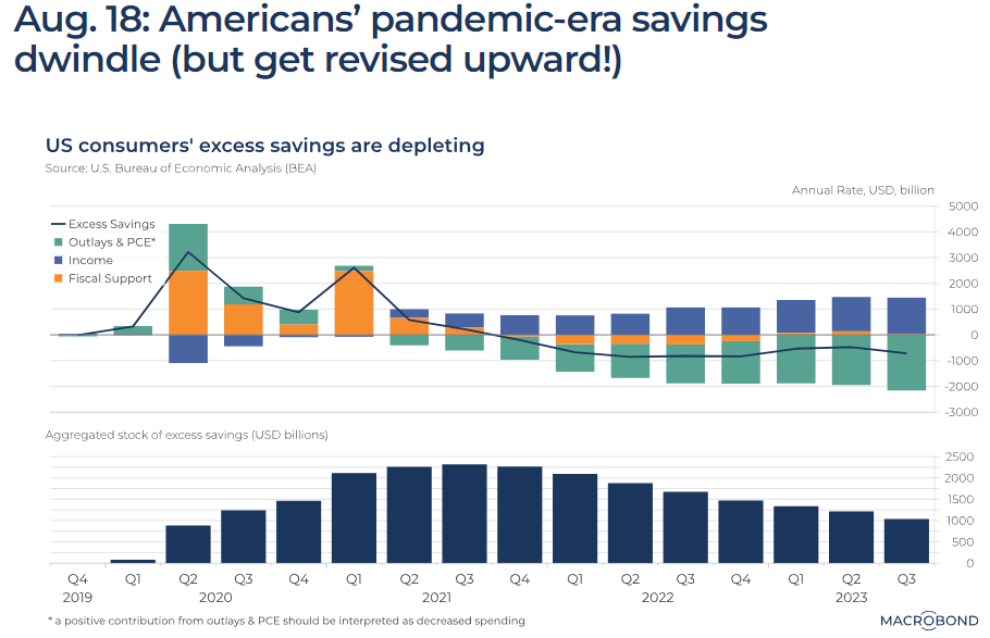 가장 널리 언급되는 후보로는 팬데믹 이후에도 미국 소비자들이 여전히 초과 저축을 하고 있는 돈이 있습니다. 샌프란시스코 연준은 소비자들이 3분기에 이러한 저축을 소진할 것으로 예상했지만, 이후 11월에 4300억 달러의 초과 저축이 남아 있으며 2024년 상반기까지 인출되지 않을 것으로 추정하는 것으로 수정했습니다. 이는 의심할 여지없이 불황의 개가 짖지 않는 데 큰 역할을 했습니다. 다음은 매크로본드의 그림입니다: