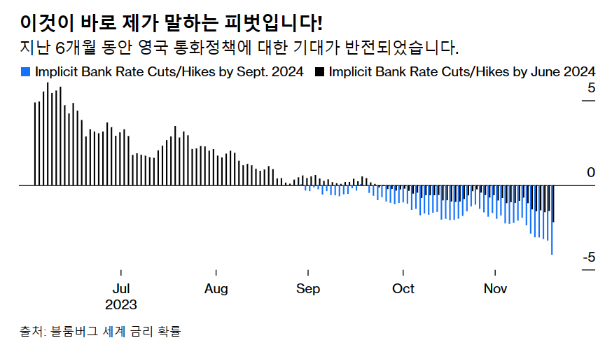 예상했던 것과는 전혀 다른 이 놀라움은 연준의 악명 높은 "피벗"보다 영란은행의 통화정책에 대한 기대치를 훨씬 더 극적으로 변화시켰습니다. 오버나이트 인덱스 스왑 시장은 내년 6월과 9월 회의에서 기준금리가 25bp 인하 또는 인상될 가능성을 이렇게 측정했습니다. 6개월 만에 5회 인상 예상이 5회 인하로 바뀌었습니다: