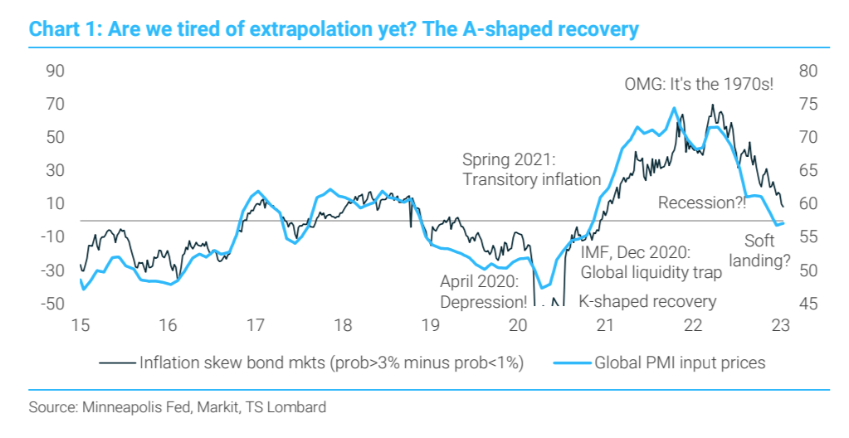 경기 침체 예측의 또 다른 문제점은 현재의 추세를 미래에 투영하려는 인간의 어쩔 수 없는 경향입니다. 이는 팬데믹 이후의 이상한 환경에서 특히 신뢰할 수 없는 것으로 드러났습니다. TSLombard의 다리오 퍼킨스는 올해 초에 발표한 이 차트에서 큰 폭의 도약과 급격한 후퇴를 반복하는 A자형 회복을 제안했습니다. 팬데믹은 이것이 '정상적인' 비즈니스 사이클이 아니며 단순히 추세를 추정할 수 없음을 의미했습니다: