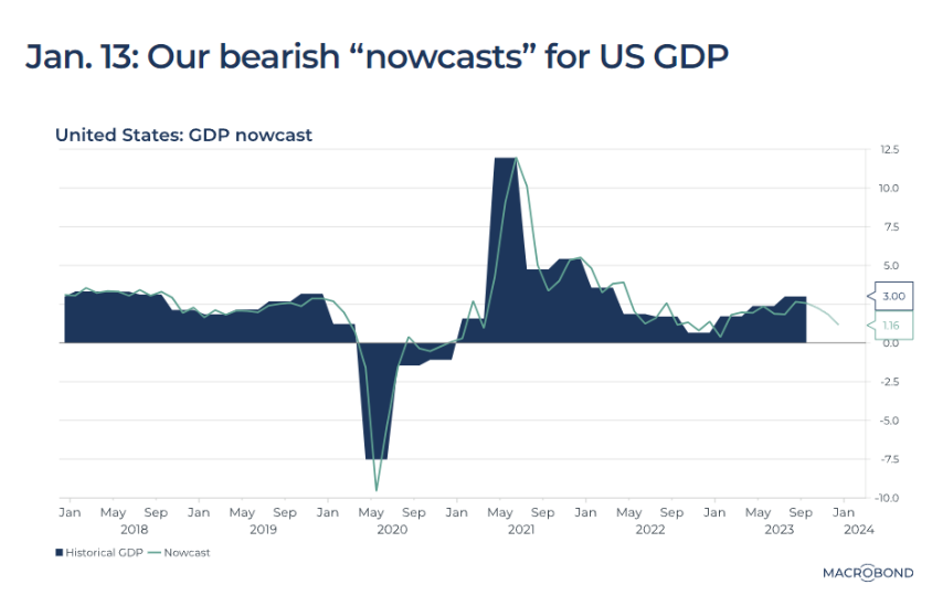 Macrobond는 2023년에 가장 인기 있었던 데이터 시각화 중 몇 가지가 예상대로 진행되지 않았다는 사실을 인정하면서 이를 정리해 발표했습니다. 이것이 가장 중요합니다. 한 해가 시작되면서 Macrobond의 "Nowcast"는 미국의 국내총생산이 급격히 둔화되는 것을 보았습니다(아직 경기 침체에 빠지지는 않았지만). 이는 이제 곧 다시 둔화될 것임을 시사합니다. 그러나 그 사이에 가속도가 붙었습니다: