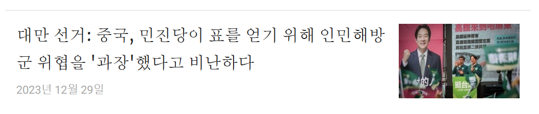 - 기사는 중국이 2024년 1월에 열리는 대만 선거를 앞두고 대만 여당인 민주진보당이 인민해방군의 활동을 과장하여 표심을 얻고 있다고 비난했다고 보도합니다.