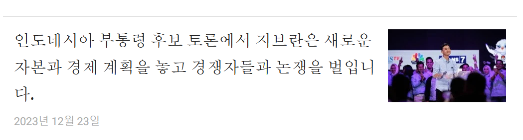 - 인도네시아 부통령 후보자 토론회: 2024년 대선을 앞두고, 세 부통령 후보자가 경제, 금융, 무역, 인프라 등의 주제로 토론을 벌였습니다.