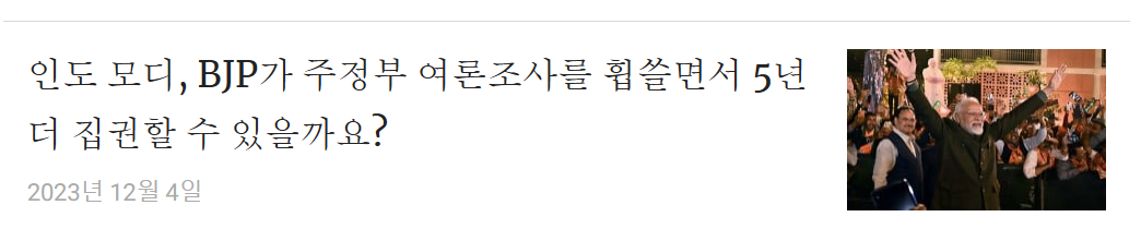 - BJP, 인도 주선거 3곳 승리: 인도의 여당 BJP가 중요한 3개 주선거에서 승리하고, 두 곳에서 야당인 콩그레스당을 교체했습니다. 이로써 나렌드라 모디 총리의 3선 가능성이 강화되었습니다.