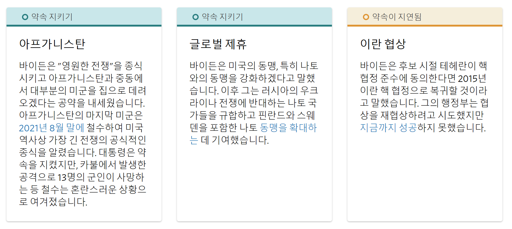 - 아프가니스탄 철수: 바이든 대통령은 2021년 8월 말까지 아프가니스탄에서 미군을 철수시키겠다고 공약했으며, 이를 이행했습니다. 하지만 이 과정에서 탈레반의 진격과 미국인과 협력자들의 대피에 대한 비판을 받았습니다.