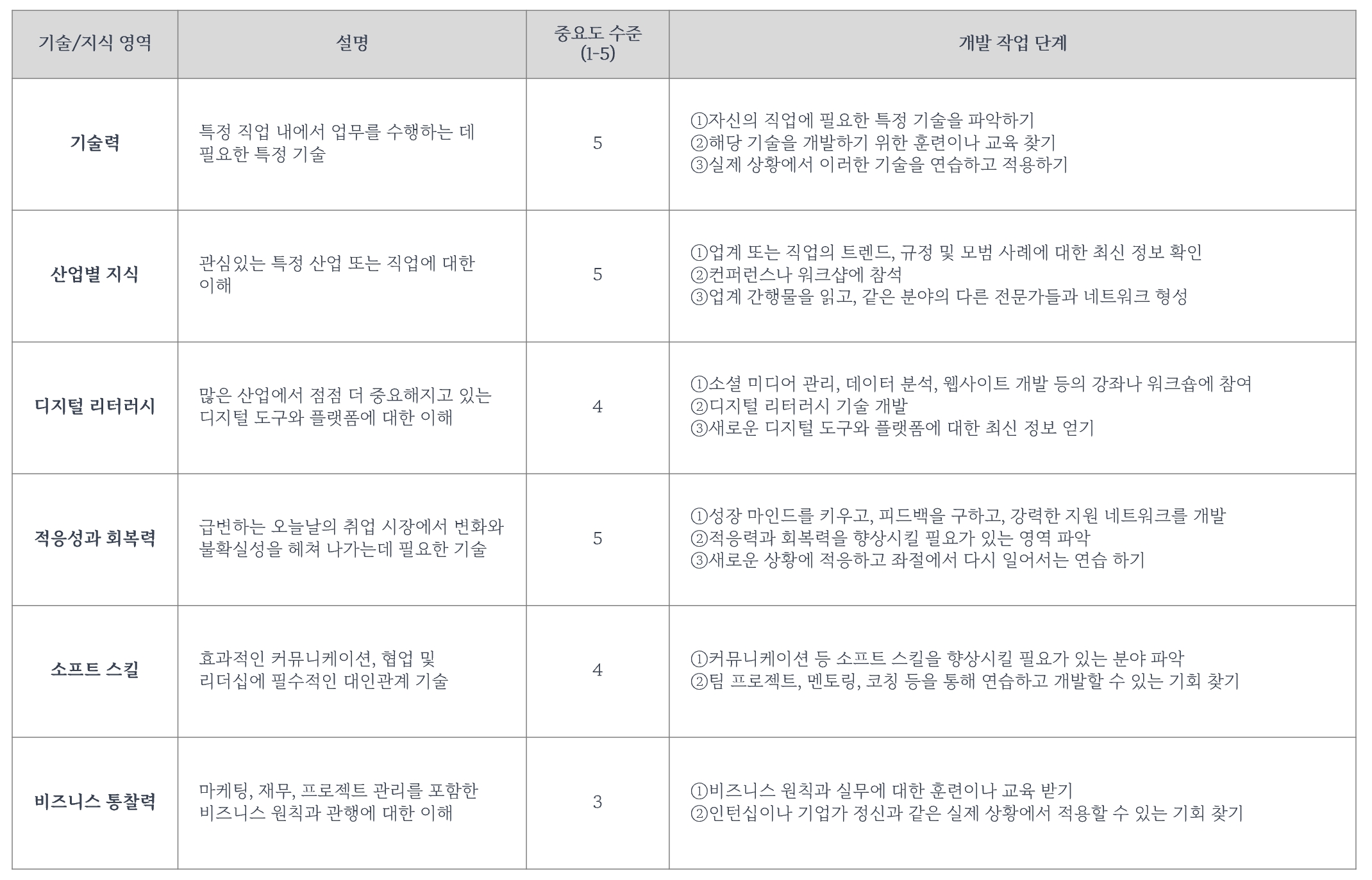 현재 하고 있거나 과거에 했던 업무들을 평가하면서 경험한 지식과 기술을 노트에 기술한다. 성장하는 사람들은 새롭게 환경이 변화해도 적응성과 회복력으로 기존에 자신이 배우고 경험한 지식과 기술을 강화하면서 변화시키는 것에서 출발한다. 특히 디지털 시대에는 디지털 역량이 무엇보다 중요하다. 새로운 기술에 대하여 지속적으로 경험하여 자기 것으로 만드는 역량이 디지털 리터러시이다.
