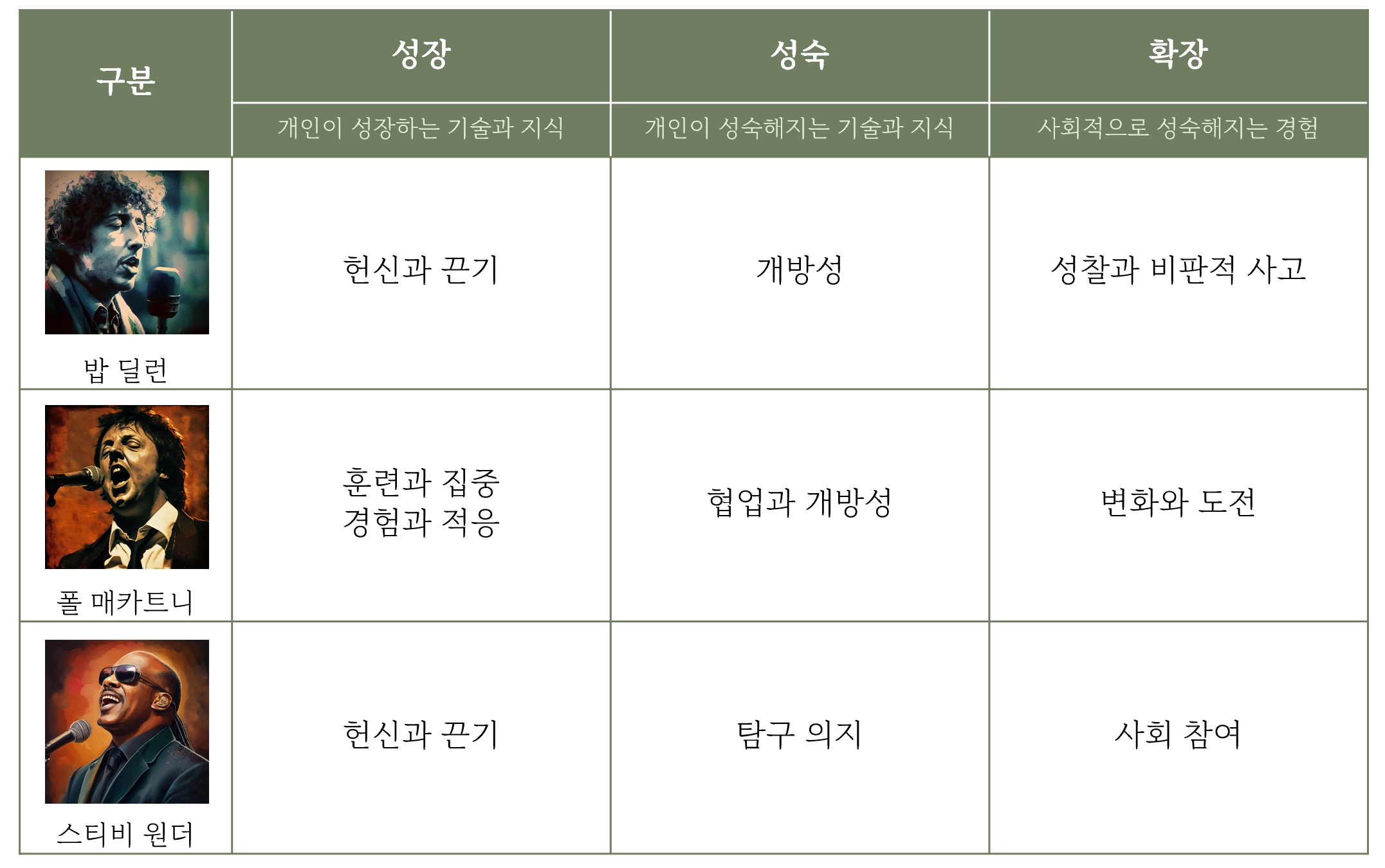 성장하면서 성숙한 사람들을 탐색하는 것을 시작한다. 역사적인 사례를 바탕으로 좀더 세부적인 완성도를 높이는 미래 인재상에 대한 가설이 되도록하기 위함이다. 세계적으로 장기적인 성과를 보인 사람들 중에 대중에게 알려진 가수, 작가, 화가, 배우, 운동선수, 과학자, 기업가를 탐색한다. 인물들의 자세한 기능적인 탐구가 아니라 성장하면서 어떻게 계속 성숙해졌는지를 알아보는 것이다. 선정은 챗GPT에 물어 보았다.