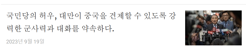 - 대만 선거 2024: DPP는 ‘완벽한 조합’ 라이-효 티켓에서 승리를 감지하지만 베이징에게는 ‘전쟁을 의미할 수 있다’. 이 티켓은 대만의 대통령 후보인 라이 청더와 미국에 대한 사실상의 대사인 효 비금이 함께 출마한 것으로, 독립 지향적인 민주진보당(DPP)이 집권을 유지할 수 있는 신호라고 분석가들은 말한다. 그러나 승리는 베이징이 이들을 "독립주의자들의 연합"으로 보고 있으며, 대만에게는 "전쟁을 의미할 수 있다"고 그들은 말한다.
