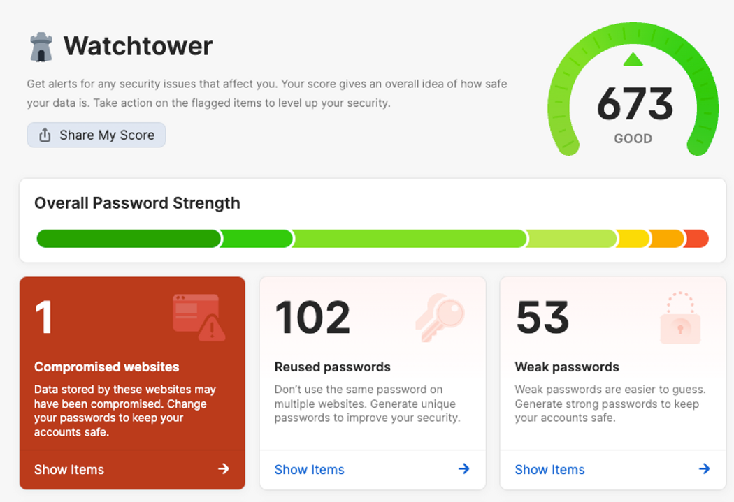 비밀번호 관리자는 1Password의 워치타워와 같은 기능을 통해 유출된 비밀번호와 취약한 비밀번호를 식별할 수 있습니다.