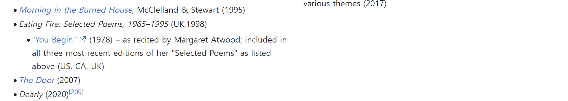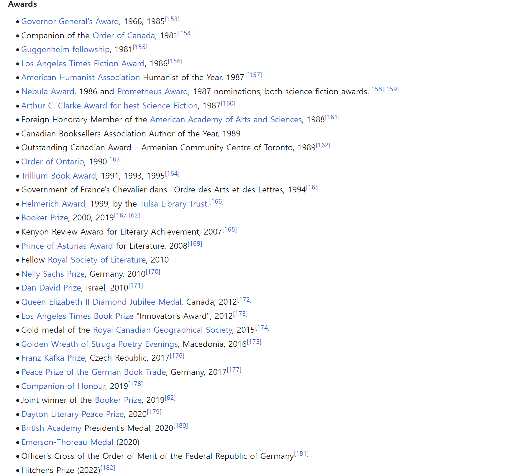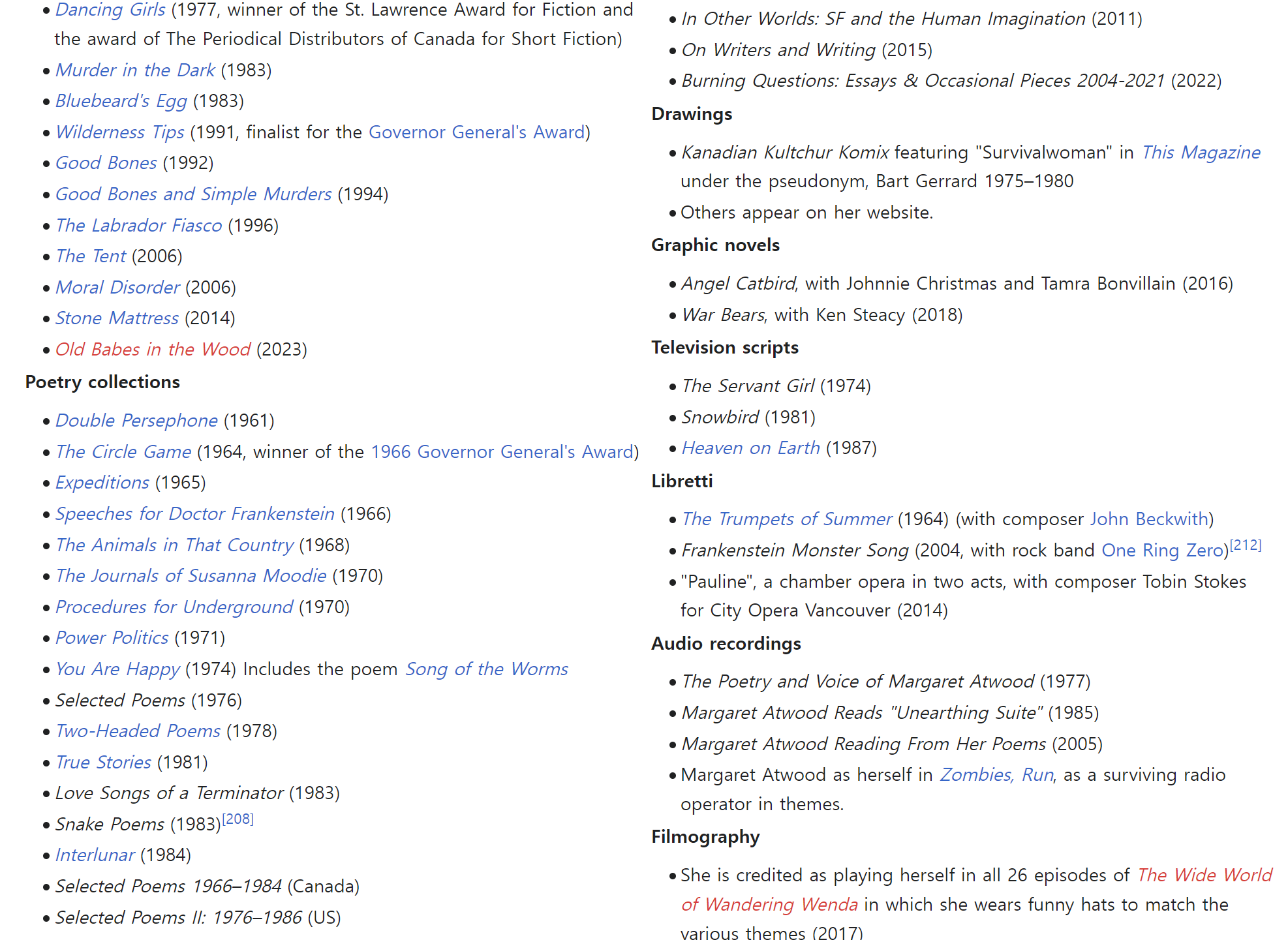 | 마가렛 애트우드 - 1969년 출판된 첫 소설 "식용 여인" | 수상 경력에 빛나는 소설을 계속 쓰고 문화 아이콘이 됨 | |