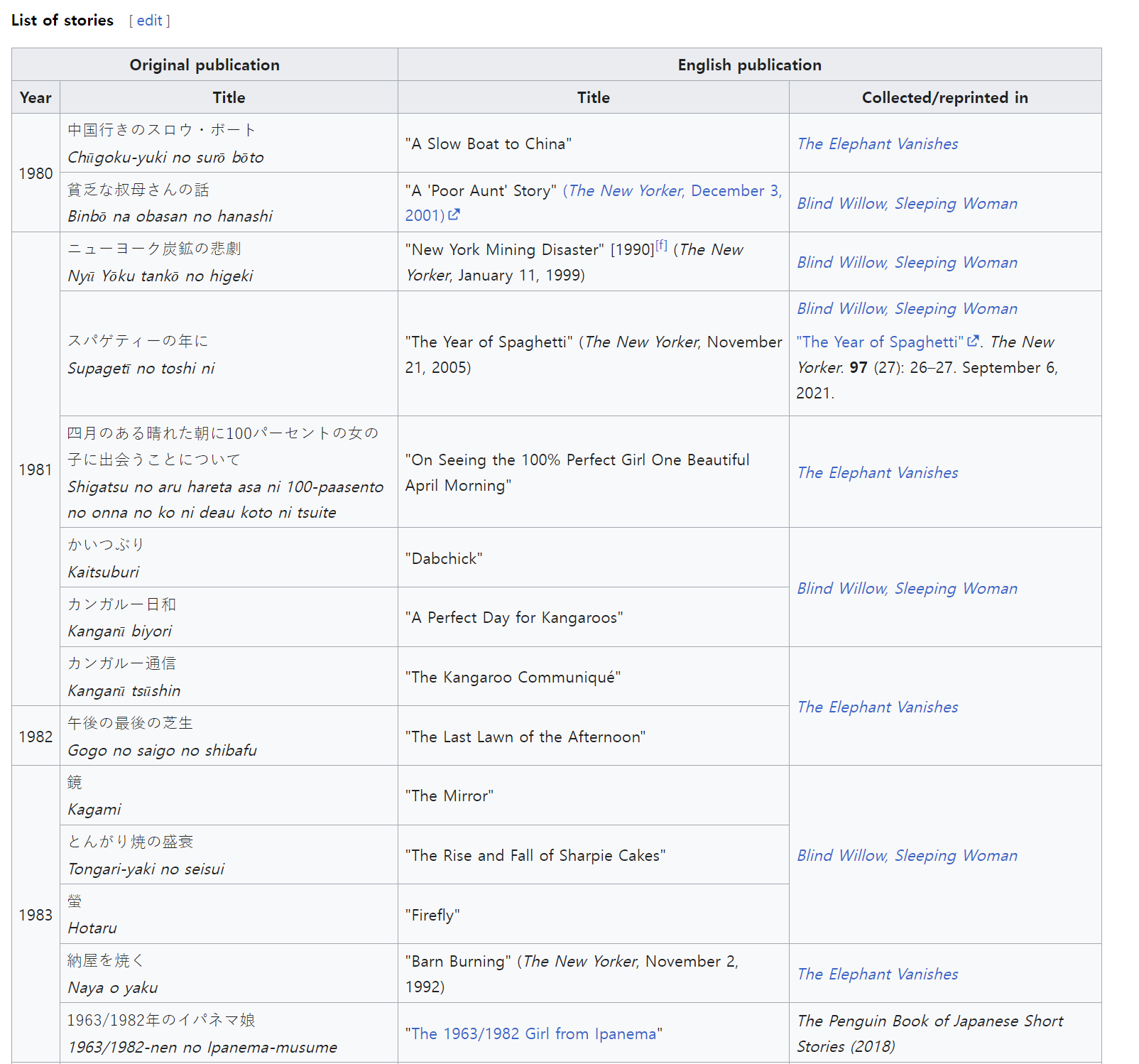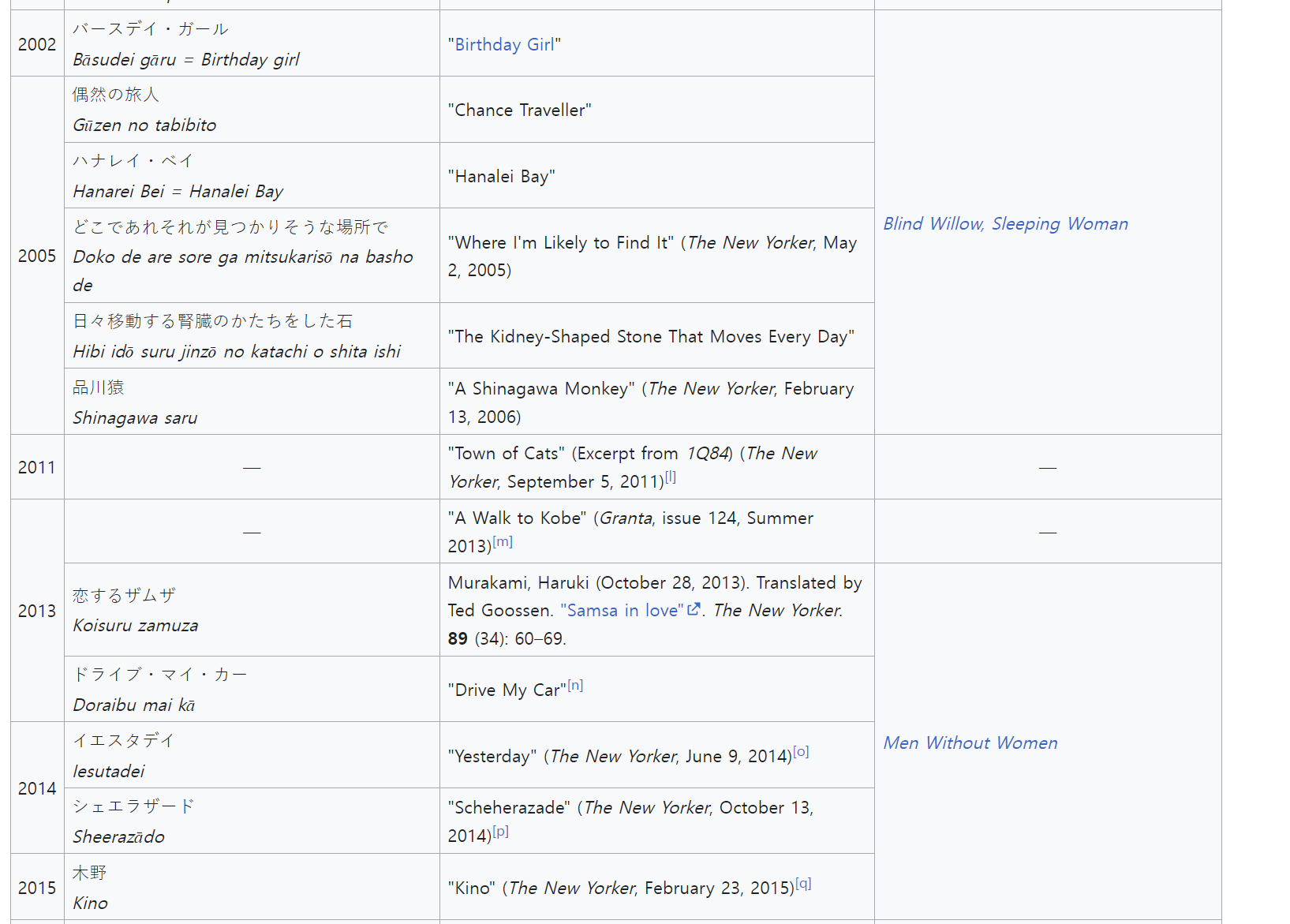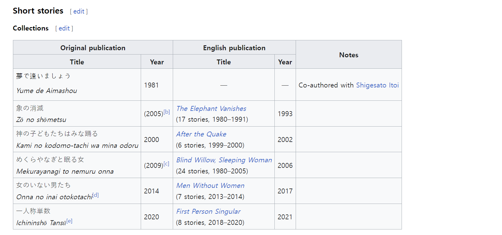 | 무라카미 하루키 - 1979년 출판된 첫 소설 "바람의 노래를 들어라" | 베스트셀러 소설을 계속 쓰고 세계적인 센세이션을 일으킴 |