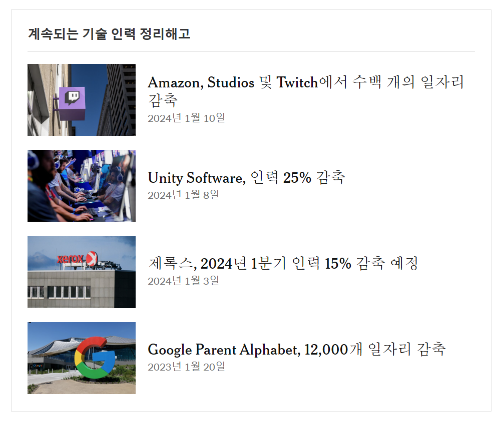 - 기술 업계의 대량 해고 추세: 구글은 메타, 아마존 등 다른 기업들이 수천 명의 직원을 해고한 작년에 이어 올해도 계속해서 직원을 감축하고 있다. 아마존은 트위치, 프라임 비디오, MGM 스튜디오에서 수백 명을 해고했고, 제록스는 전체 직원의 15%를, 유니티 소프트웨어는 25%를 감축했다.