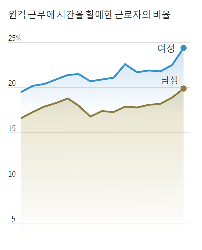 고용 데이터 제공업체인 라이브 데이터 테크놀로지스(Live Data Technologies)가 200만 명의 사무직 근로자를 대상으로 분석한 결과에 따르면, 지난 한 해 동안 원격 근무자는 사무실에서 근무하는 정규직 또는 하이브리드 근무자보다 승진하는 빈도가 31% 낮았습니다. 또한 원격 근무자는 멘토링을 덜 받는데, 특히 여성에게 이러한 격차가 두드러진다는 연구 결과가 나왔습니다.