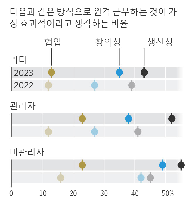 원격 근무는 동료와 사무실을 공유하지 않는 엔지니어보다 코드에 대한 피드백을 22% 더 많이 받기 때문에 기술을 쌓으려는 젊은 여성 엔지니어에게 특히 비용이 많이 들 수 있습니다. 팀과 같은 건물에서 근무하는 여성 엔지니어는 같은 건물에 있지 않은 여성 엔지니어보다 코드에 대한 피드백을 40% 더 많이 받습니다. 하지만 일부 근로자는 여전히 경력에 미칠 영향을 염두에 두고 오피스를 선택합니다. 사무직 취업 시장이 좁아지면서 더 많은 회사 리더들이 직접 출근해야 한다고 목소리를 높이고 있습니다. 소프트웨어 회사인 Egnyte는 여러 사무실에서 배지를 사용하여 출석을 추적하고 있으며, 반경 50마일 이내에 있는 직원들에게 일주일에 3일은 출근하도록 요청했습니다. 이 회사는 완전히 원격 근무하는 직원도 사무실 근처에 거주하는 직원과 동일한 승진 기회를 가질 수 있도록 노력하고 있으며, 고위 경영진은 다른 지역의 원격 근무자를 만나기 위해 노력하고 있습니다. 데이터에 따르면 하이브리드 근무자와 주 5일 사무실에 출근하는 직원 간의 승진률에는 차이가 없는 것으로 나타났습니다. 하지만 승진이 곧 관리직 승진을 의미하는 경우, 대면 회의가 오랫동안 일반적이었던 곳에서 원격 근무자는 불이익을 받을 수 있습니다. 일부 완전 원격 근무자들은 청구서를 지불할 수 있는 충분한 돈을 벌고 자신과 자녀의 균형 잡힌 삶을 살 수 있다면 직업적 희생을 감수할 수 있다고 생각합니다.