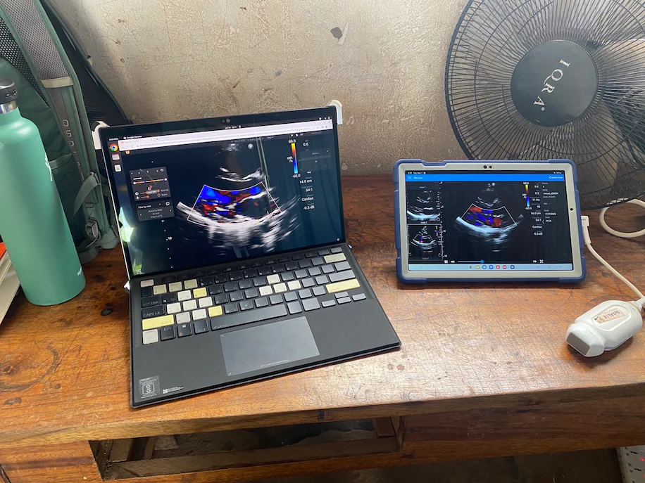 이 새로운 검사 도구가 우간다와 미국 규제 당국의 승인을 받으면 각 간호사에게 심장 이미지를 생성하는 컴퓨터 마우스 크기의 프로브와 AI 구성 요소가 장착된 태블릿이 제공됩니다.