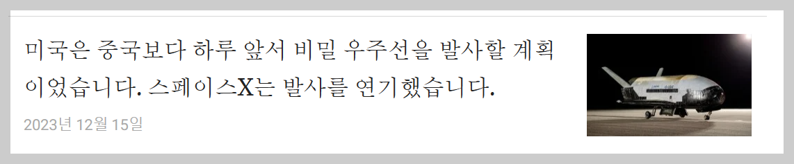 - 중국의 비밀 우주 비행기: 중국은 2023년 12월 15일 목요일에 재사용 가능한 실험 우주 비행기를 성공적으로 발사했습니다. 이 비행기는 2020년과 2022년에 이어 세 번째로 발사되었으며, 기술적 세부사항이나 이미지는 공개되지 않았습니다.