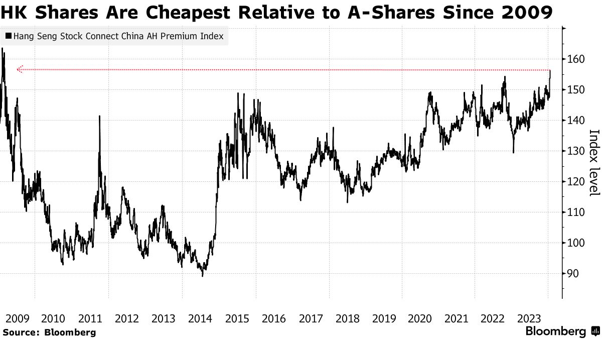 - 홍콩 주식의 36% 할인: 중국 내부의 경기 둔화와 저조한 자극책으로 인해 홍콩에 상장된 중국 주식들이 급락하고 있습니다. 홍콩의 항생 중국 기업 지수는 20년 만에 최저 수준에 근접하고, 중국 본토의 CSI 300 지수와 비교하면 15년 만에 가장 큰 차이를 보이고 있습니다.