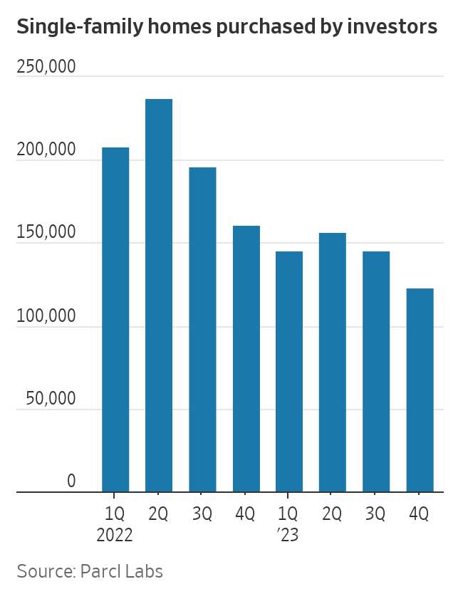 - 부동산 투자자들의 주택 구매 감소 : 2023년에는 이자율과 주택 가격이 상승하면서 단독 주택을 임대 목적으로 구매하는 투자자들의 활동이 29%나 감소했습니다.
