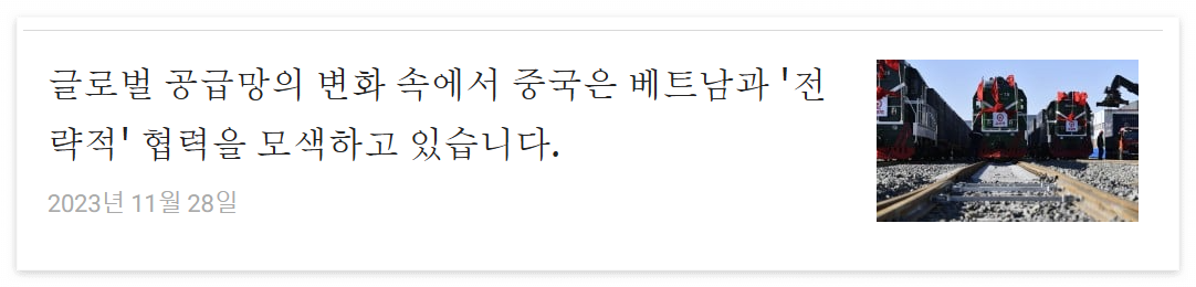 - 베트남, 중국 기업에 유리한 환경 제공: 베트남은 미국과 주도하는 무역 협정에 참여하고 있으며, 중국과의 관계도 개선하고 있다. 베트남은 중국 기업들에게 투자를 장려하고 공정하고 편리한 환경을 만들어주겠다고 밝혔다.