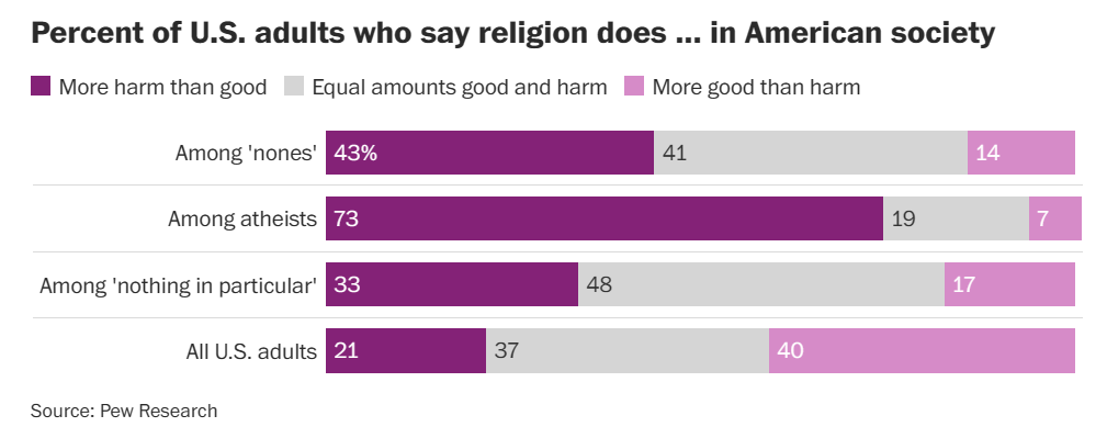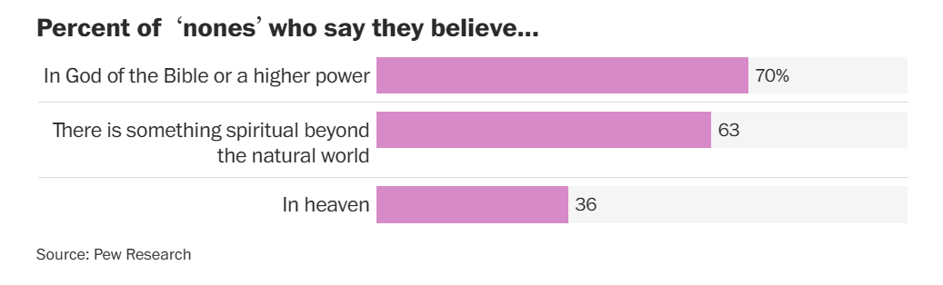 무종교인의 대다수는 성경의 신 외에 '더 높은 힘'을 믿으며, 67%는 인간에게 영혼이나 영이 있다고 믿고, 과반수는 인간이 아닌 동물과 자연의 일부가 영적인 에너지를 가질 수 있다고 답했습니다. 종교가 분열과 편협함을 야기하고 미신과 비논리적 사고를 조장한다는 응답이 압도적으로 많았지만, 58%는 종교가 사람들에게 의미와 목적을 부여함으로써 사회에 도움을 준다고 답했습니다.