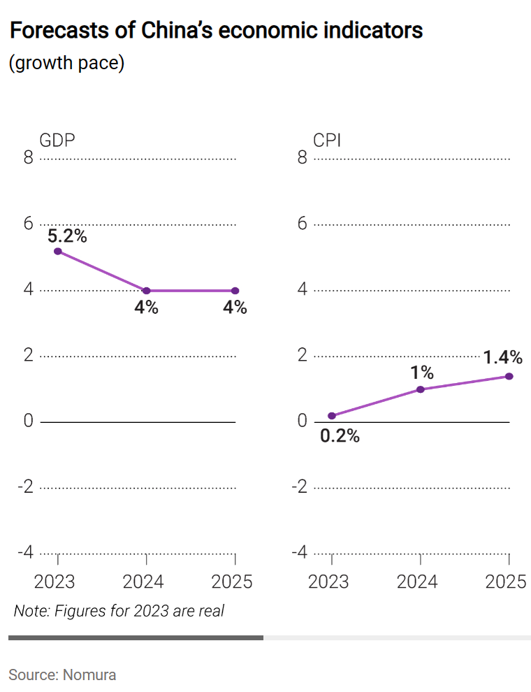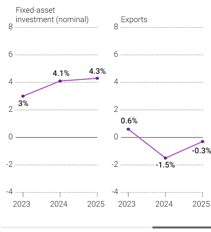 - 고정 자산 투자: 고정 자산 투자는 2023년에 **3%**로 증가한 후, 2024년에는 4.1%, 2025년에는 **4.3%**로 더 증가할 것으로 예측됩니다. 이는 중국이 인프라 투자를 확대하고 경제 성장을 지원하기 위한 정책을 시행할 것이라는 가정에 기반합니다.