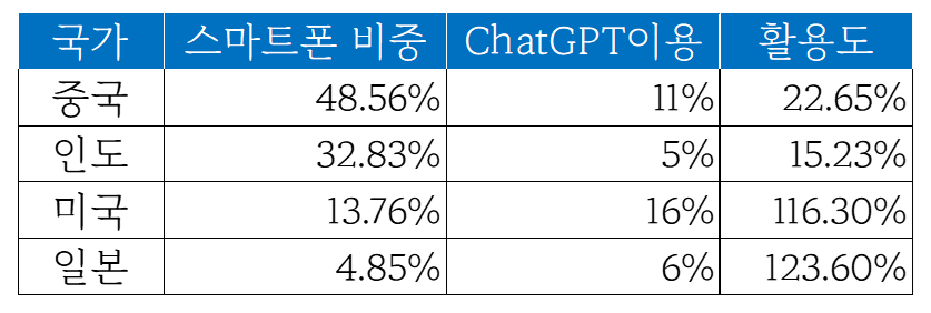 우리의 인구에 비해 상대적으로 높은 인구수를 가진 나라라고 그냥 넘기는 것은 현재의 경제전쟁의 양상을 이해하지 못하는 것이 될 것입니다. 그래서 이 데이타를 좀 더 구체적으로 이해하기 위해 스마트폰 사용자를 기준으로 활용도를 산출해 보았습니다. 네 나라가 100대의 스마트폰을 가지고 있다고 가정하고 트래픽에 따른 활용도는 미국과 일본은 100% 넘기고 있고, 중국과 인도는 각각 약 22%와 15% 였습니다. 특히 일본의 높은 활용도는 어떤 의미일까요? 콘텐츠를 생산하는 일에 앞서 있는 일본이 상대적으로 높은 활용도를 가진 다는 것은 앞으로 개인의 창작 능력과 코파일럿을 활용한 창작 능력의 싸움이 시작될 것이라는 상상을 하게 됩니다.