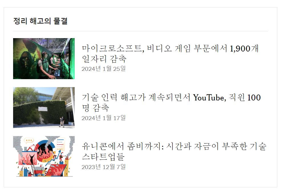 - 테크 기업의 최근 인력 감축: 아마존, 구글, 마이크로소프트 등의 테크 기업들이 올해 들어 작년보다 다른 방식으로 인력을 감축하고 있다. 작년에는 대규모 해고가 이뤄졌지만, 올해에는 특정 부서나 역할에 집중적으로 인력을 줄이고, 핵심 제품에 자원을 투자하고 있다.