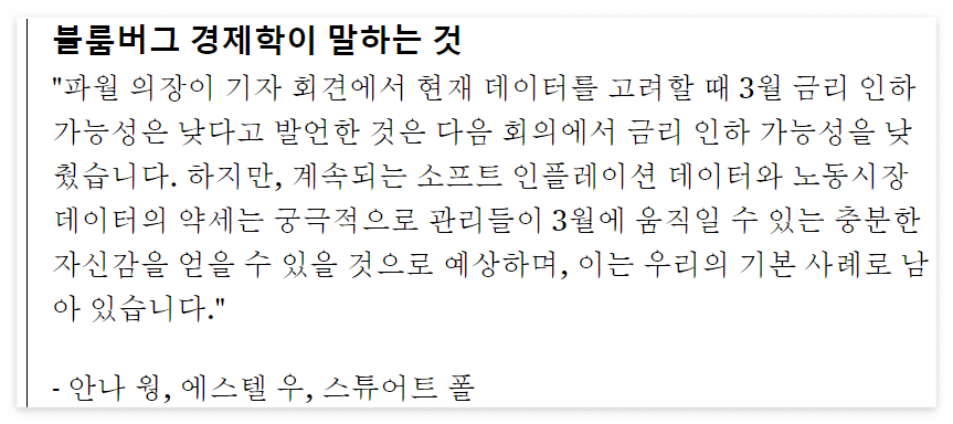 - 파월 의장은 3월에 금리를 인하할 가능성이 낮다고 밝혔다.