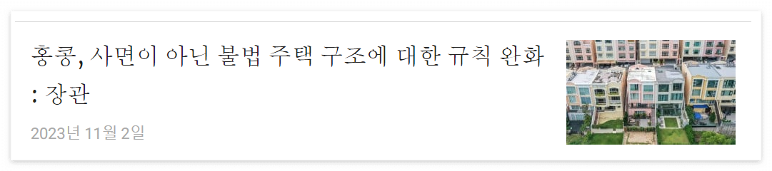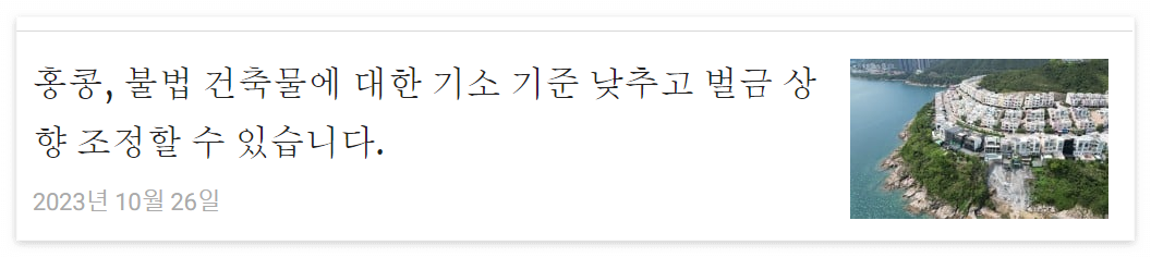 - 불법 구조물 처벌 강화 계획: 홍콩 정부는 불법 구조물을 가진 주택 소유주에 대한 기소 임계값을 낮추고 벌금을 높이는 방안을 내년에 검토할 예정이다.