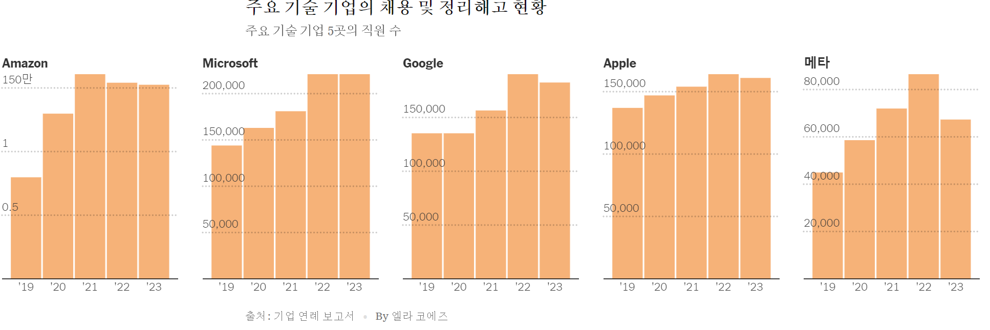 - 인력 축소와 A.I. 투자: 애플, 아마존, 메타, 마이크로소프트, 구글 등 테크 대기업들은 판매와 이익이 증가하고 주가가 상승하는 가운데, 일부 부서에서 인력을 축소하고 A.I. 기술에 수십억 달러를 투자하고 있다.