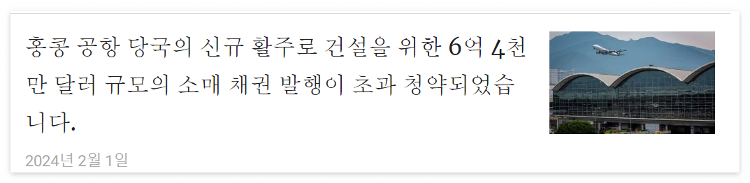 - 공항청의 소매채권: 홍콩 공항청이 20년 만에 일반 공모로 발행한 5억 홍콩달러 규모의 소매채권은 **4.25%**의 이자율과 2.5년의 만기를 가지고 있다. 이 채권은 3배 이상의 과잉청약을 받았다.
