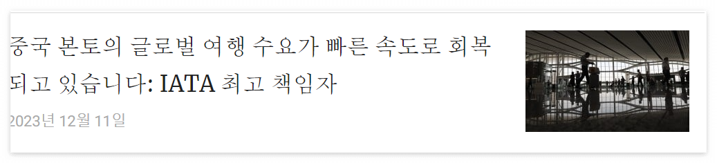 - 중국 본토의 국제 여행 수요 회복 : IATA 책임자는 중국 본토를 오가는 글로벌 여행 수요가 빠른 속도로 회복되고 있으며 내년에는 2019년 수준으로 돌아올 것으로 예상한다고 말했습니다.